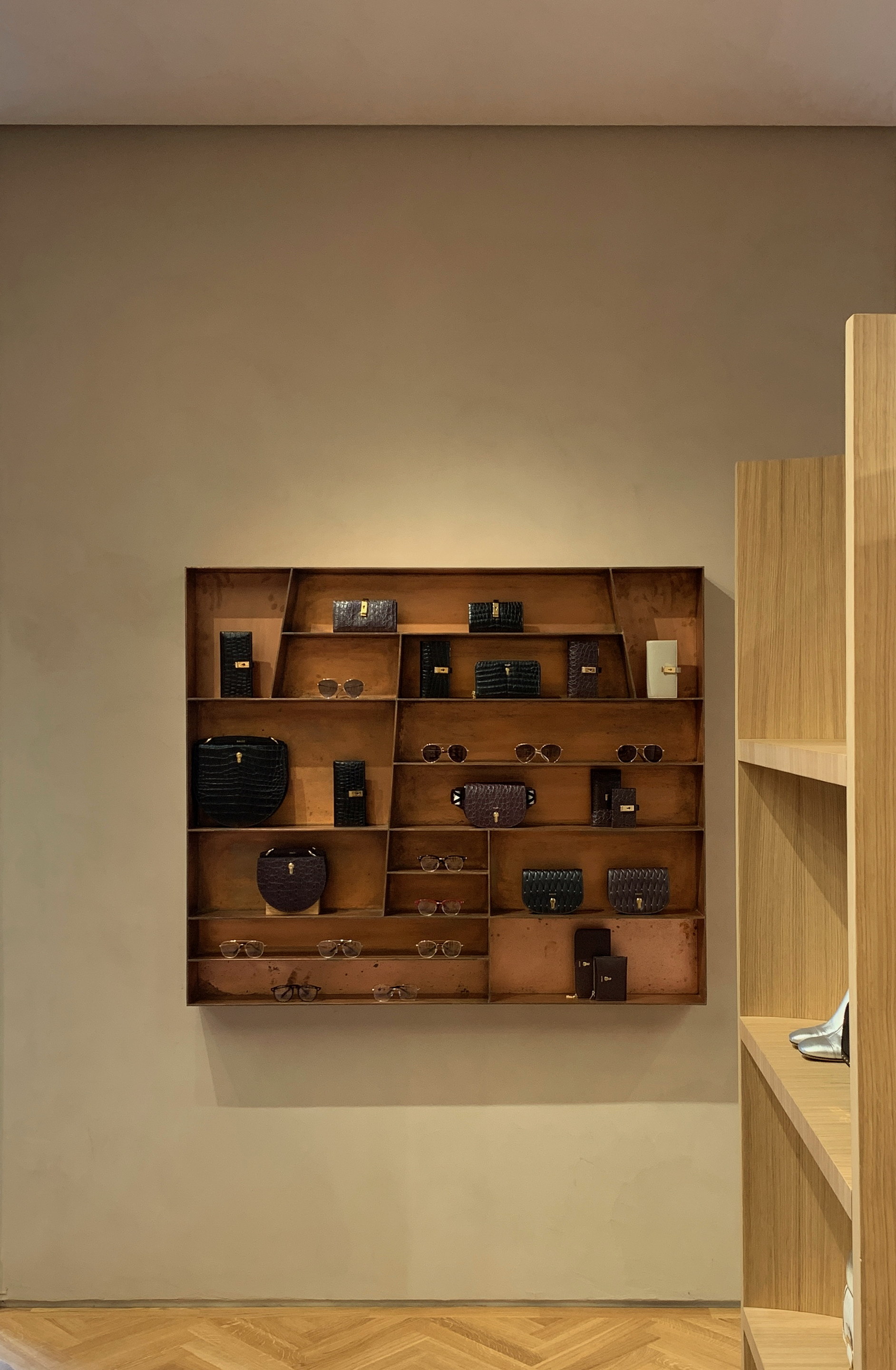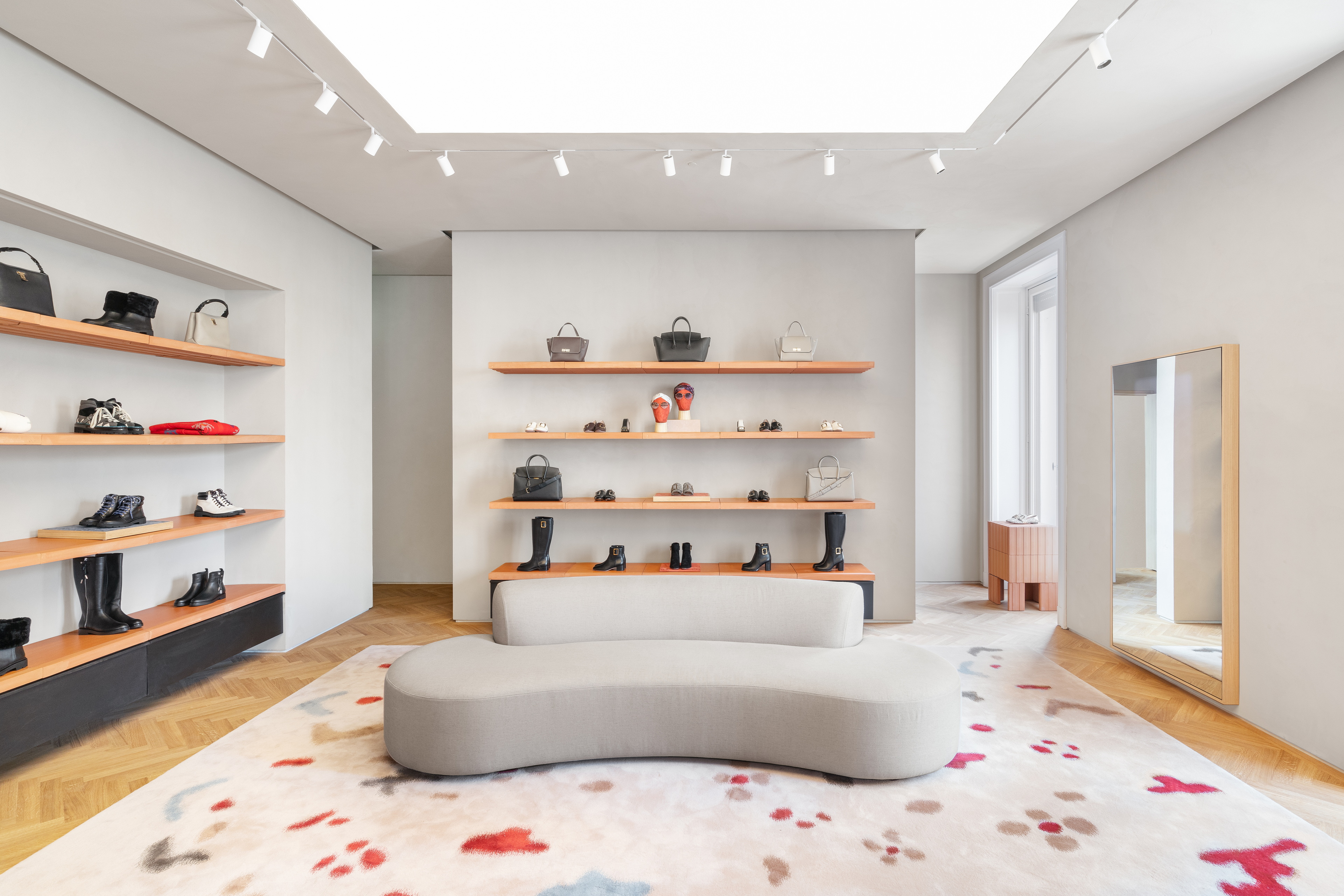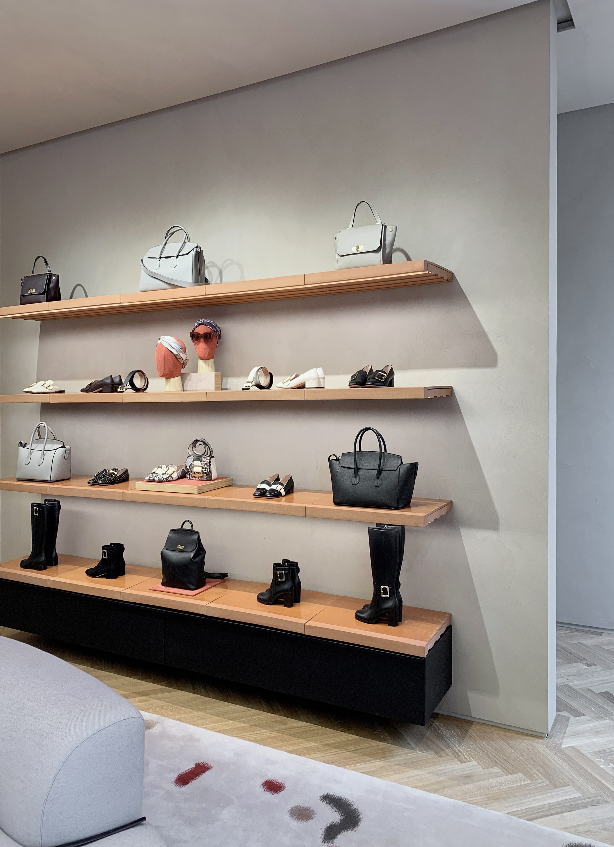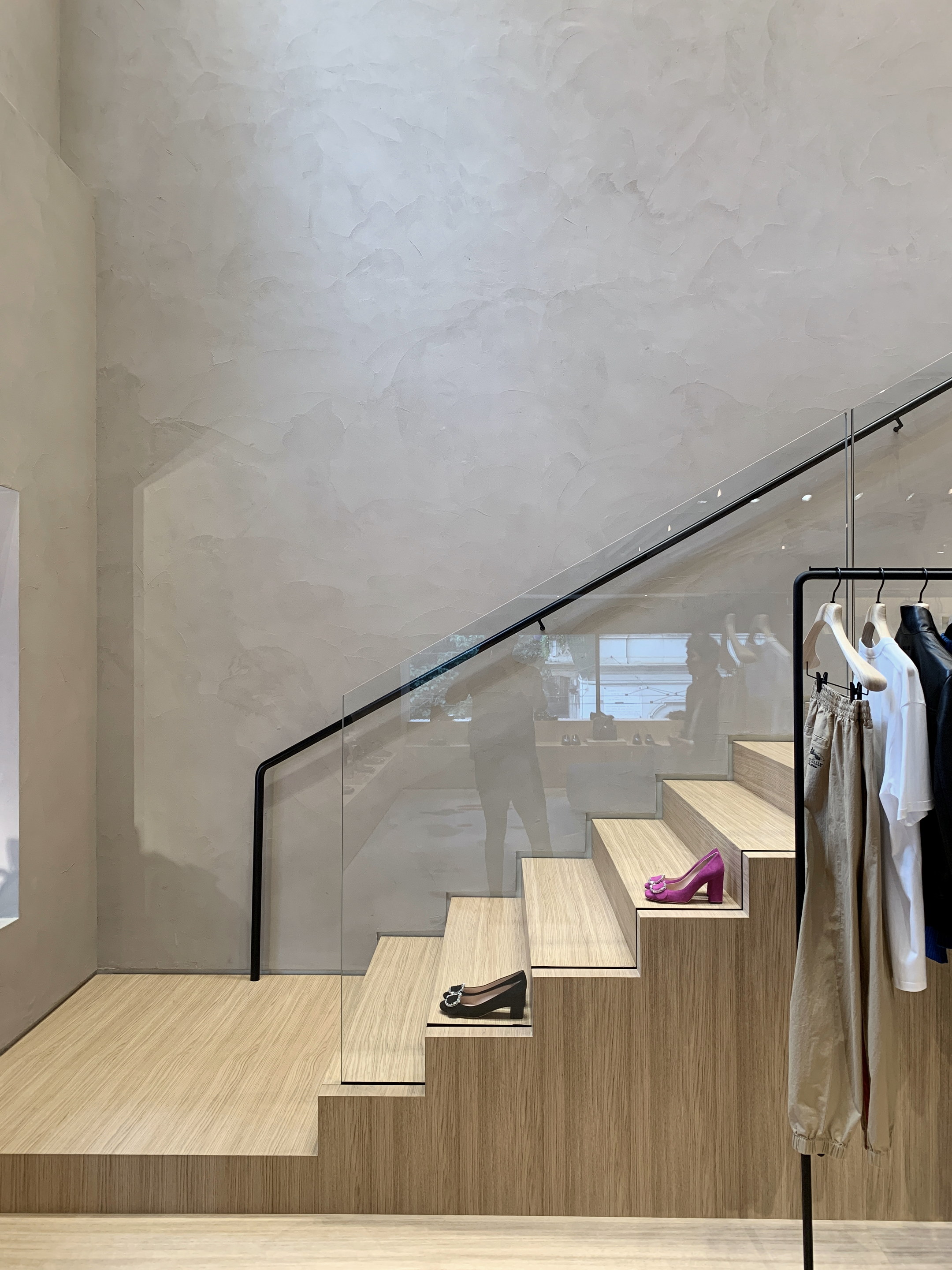 Negozio Bally in Via Montenapoleone a Milano su progetto di Casper Mueller Kneer Architects, realizzato con intonaco di finitura in argilla a grana fine TerraVista Liscio colore personalizzato di Matteo Brioni, applicato su pareti e mensole, foto di Paul Riddle, Bally e Matteo Brioni
