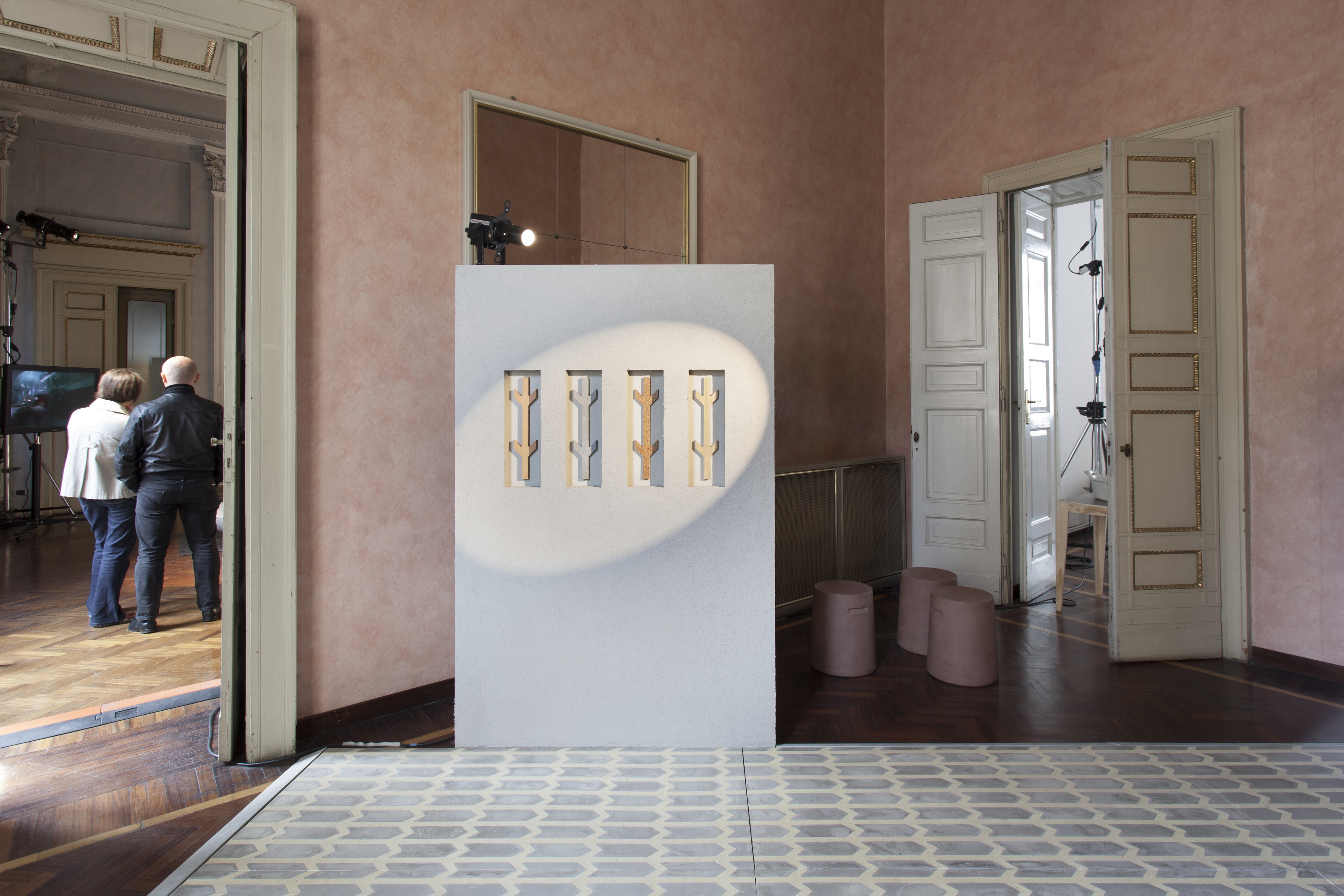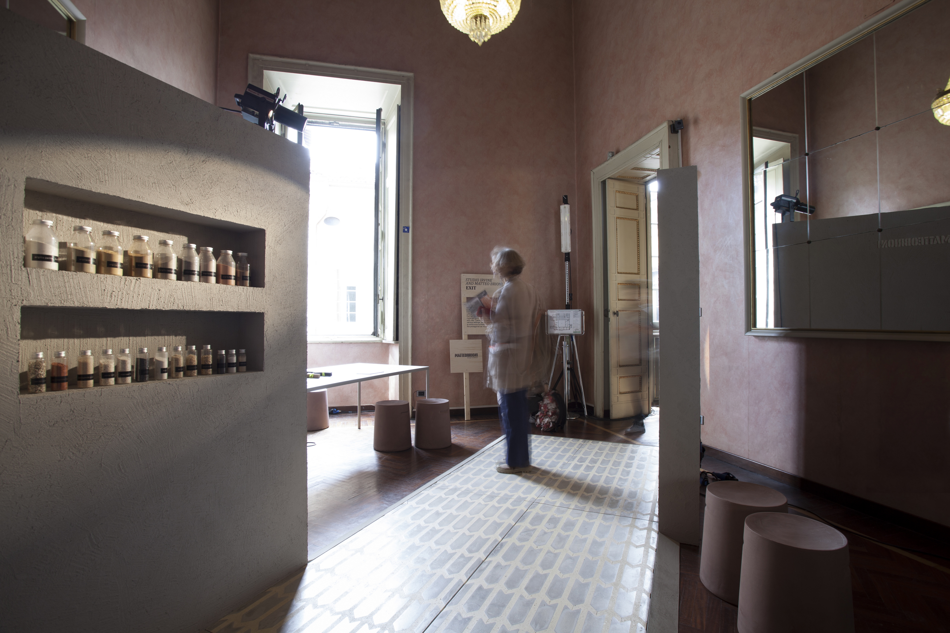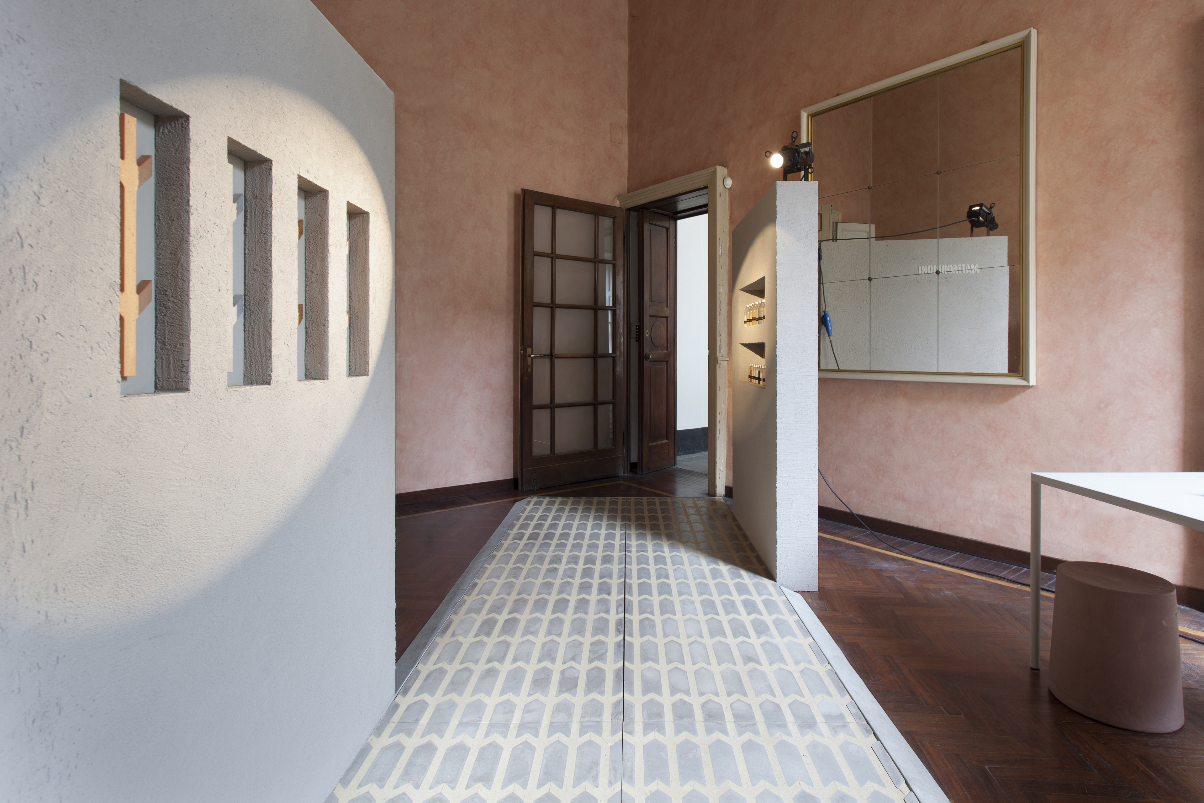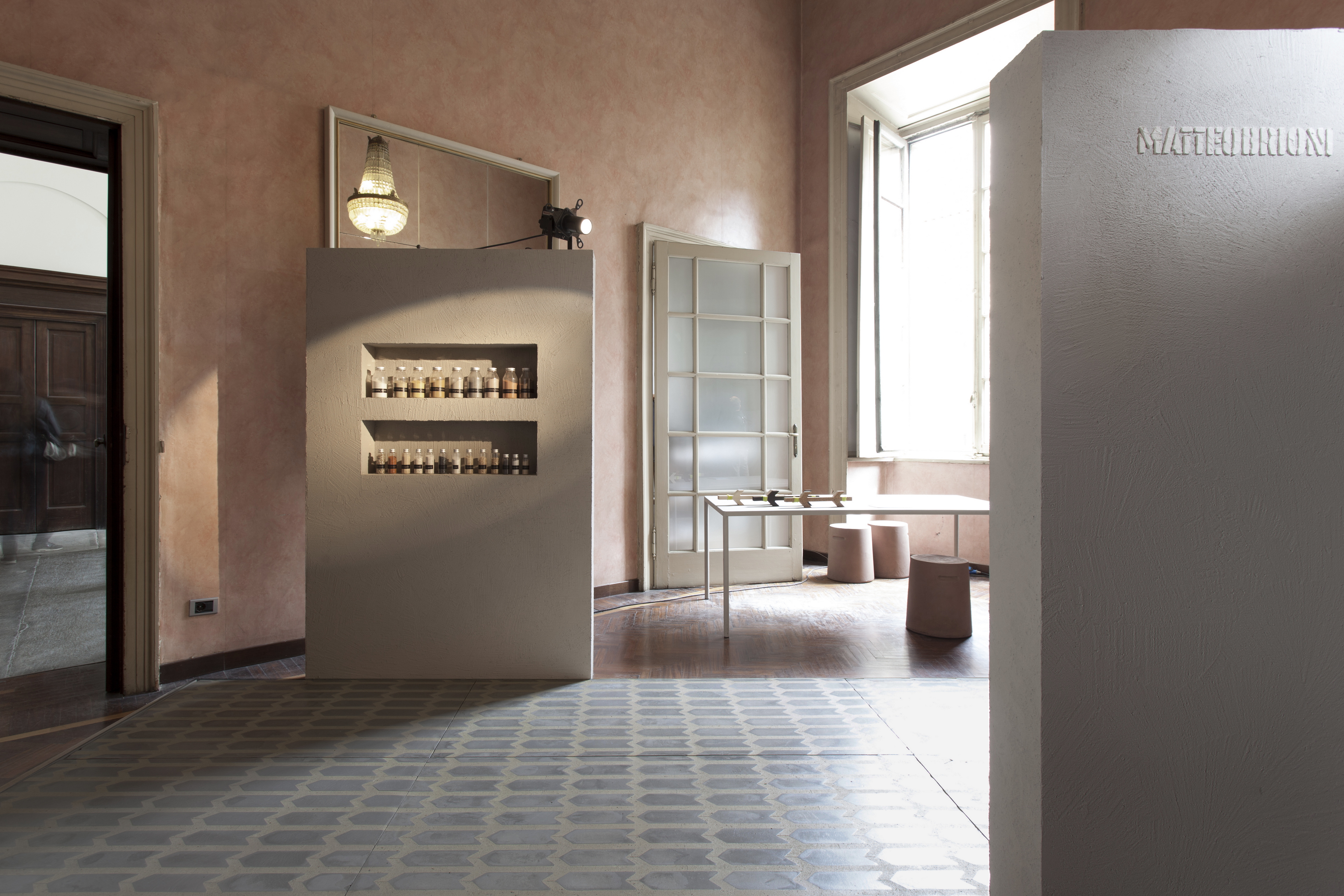 Installazione Exit di Matteo Brioni a Palazzo Litta, Milano realizzata con finitura minerale a pavimento TerraTon Floor Liscio Sale Grigio, intonaco di finitura in argilla a grana fine TerraVista Liscio Panna con inserti Exit di Marialaura Rossiello Studio Irvine L’espositore per bottiglie in argilla di Matteo Brioni è realizzato con intonaco in argilla a grana grossa MultiTerra Strutturato Panna.