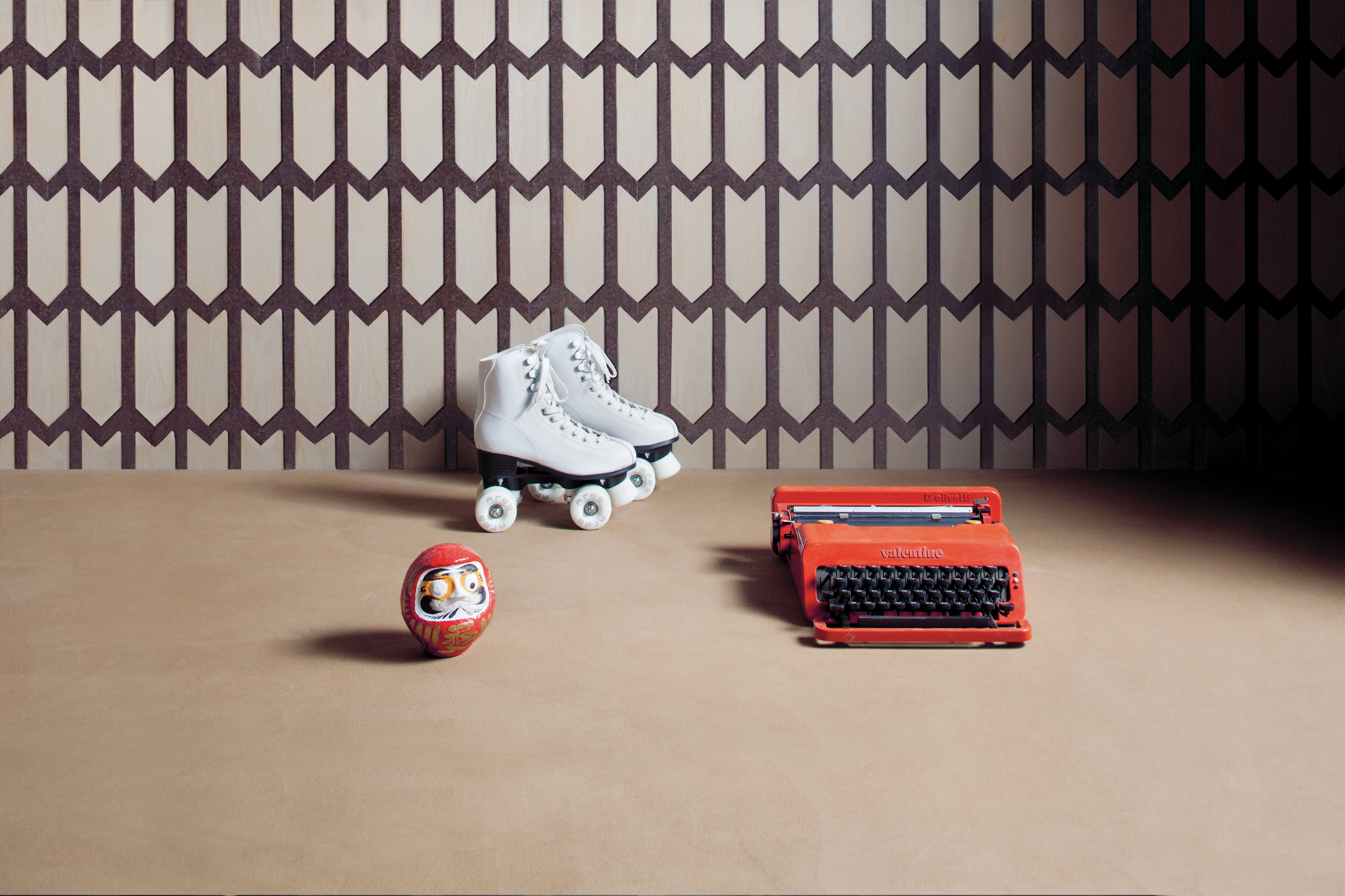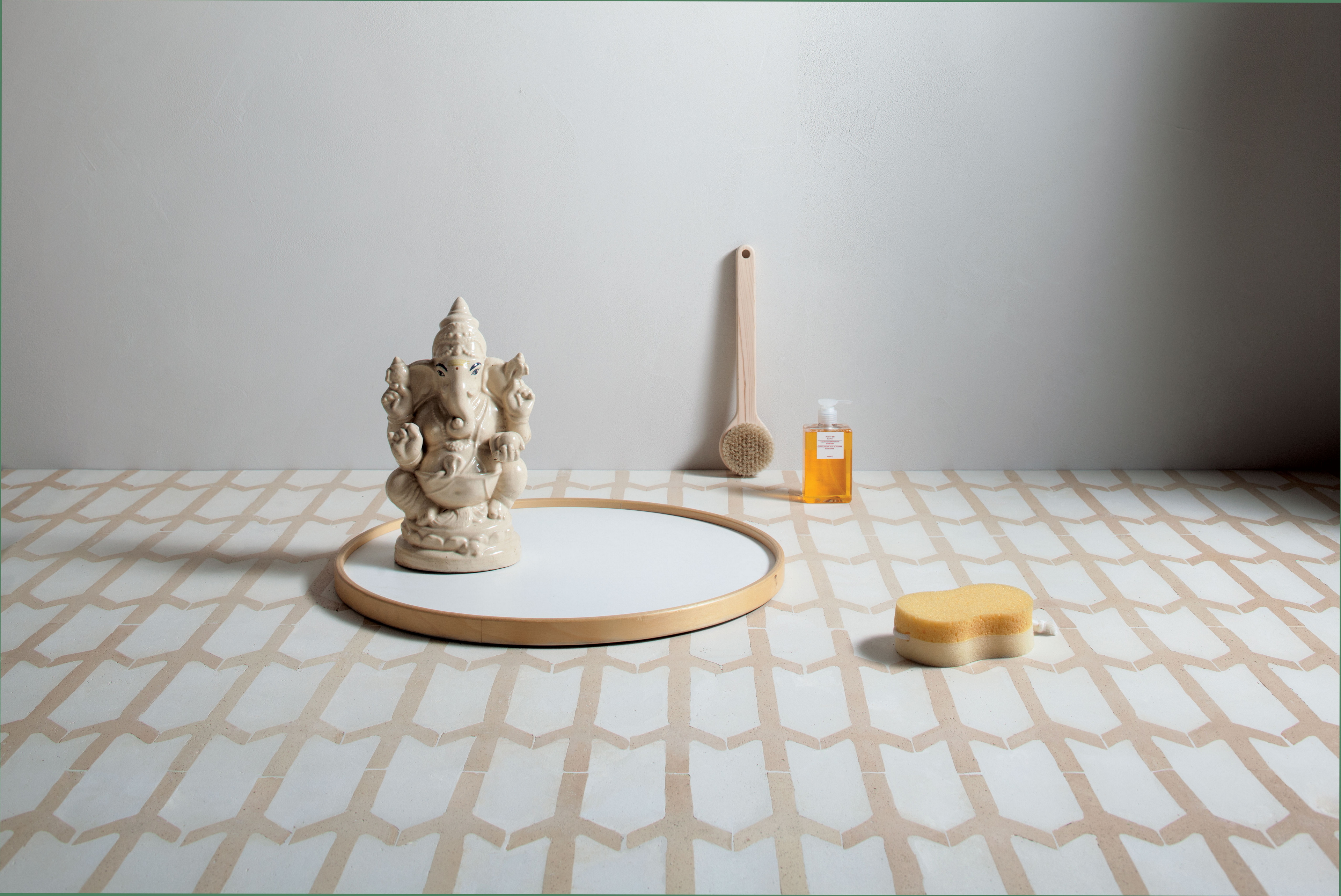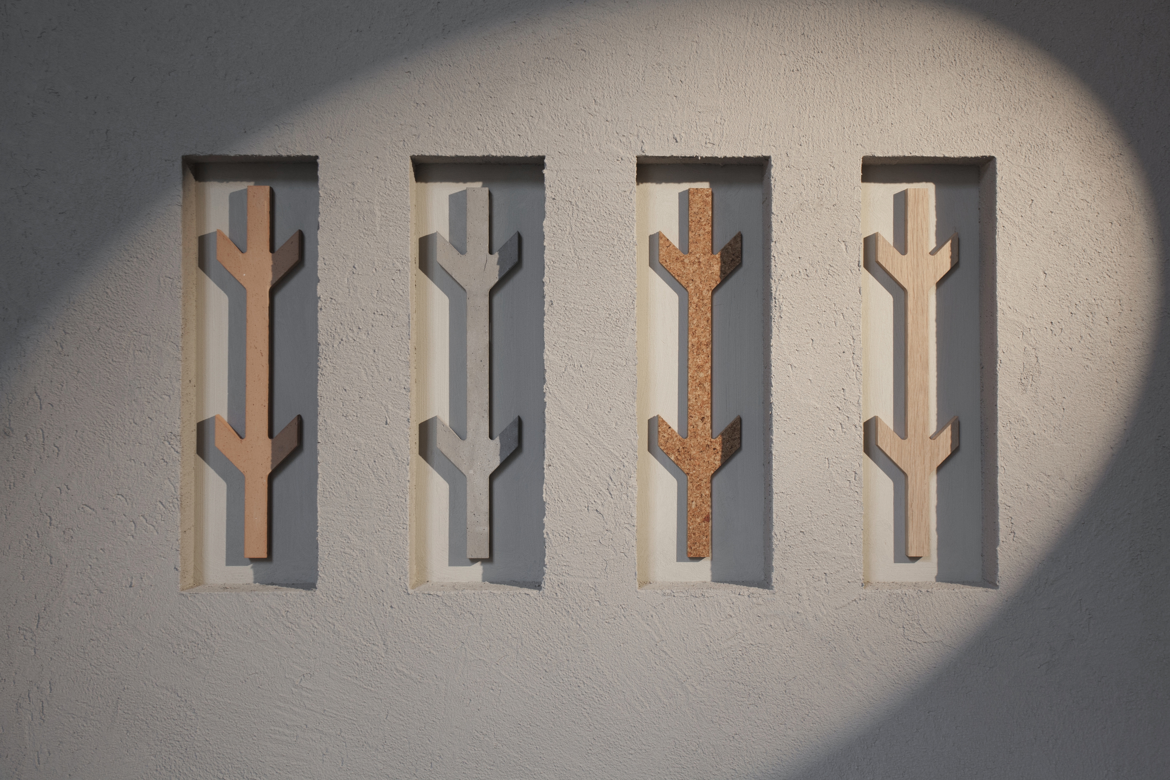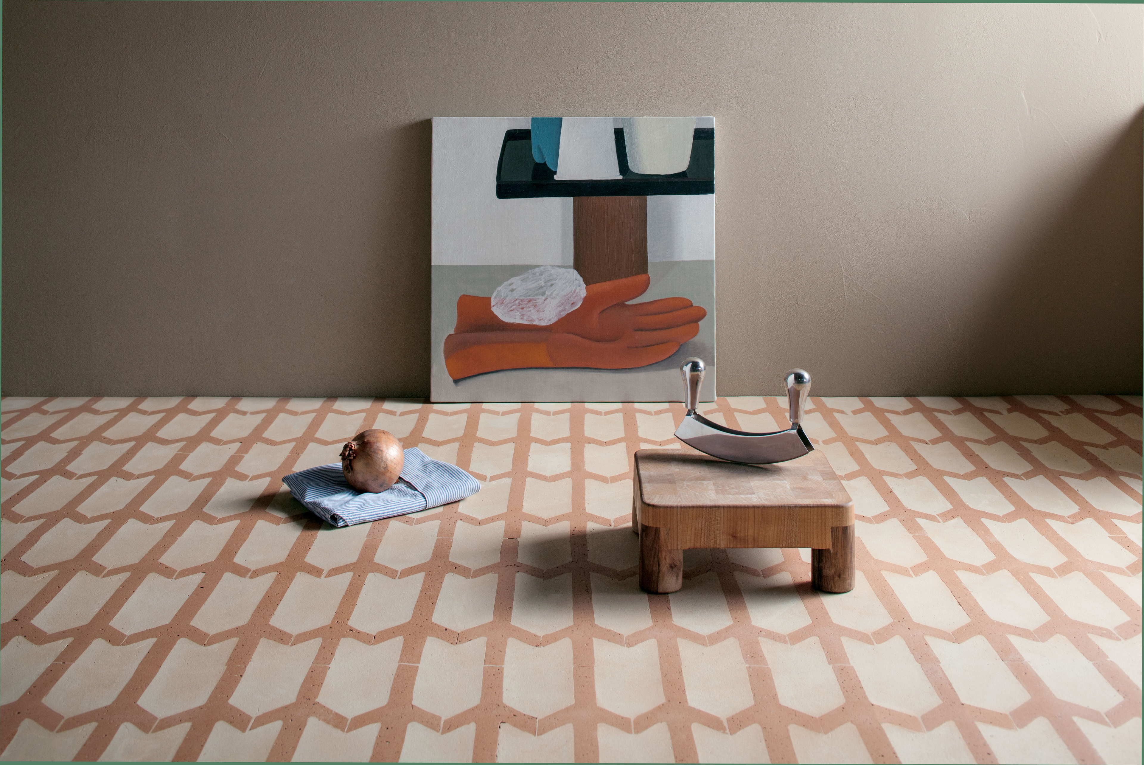 Installazione Exit di Matteo Brioni a Palazzo Litta, Milano realizzata con finitura minerale a pavimento TerraTon Floor Liscio Sale Grigio, intonaco di finitura in argilla a grana fine TerraVista Liscio Panna con inserti Exit di Marialaura Rossiello Studio Irvine L’espositore per bottiglie in argilla di Matteo Brioni è realizzato con intonaco in argilla a grana grossa MultiTerra Strutturato Panna.