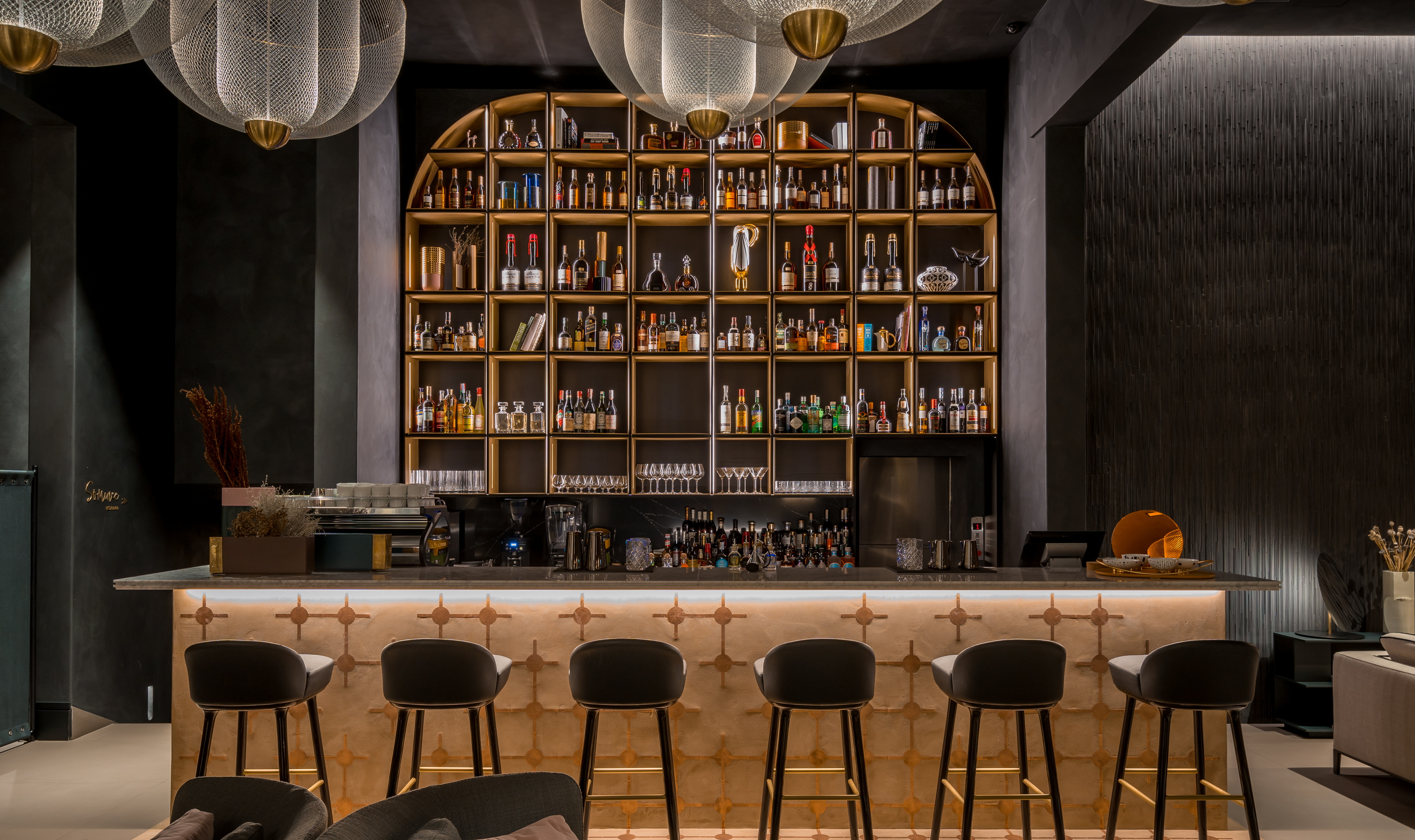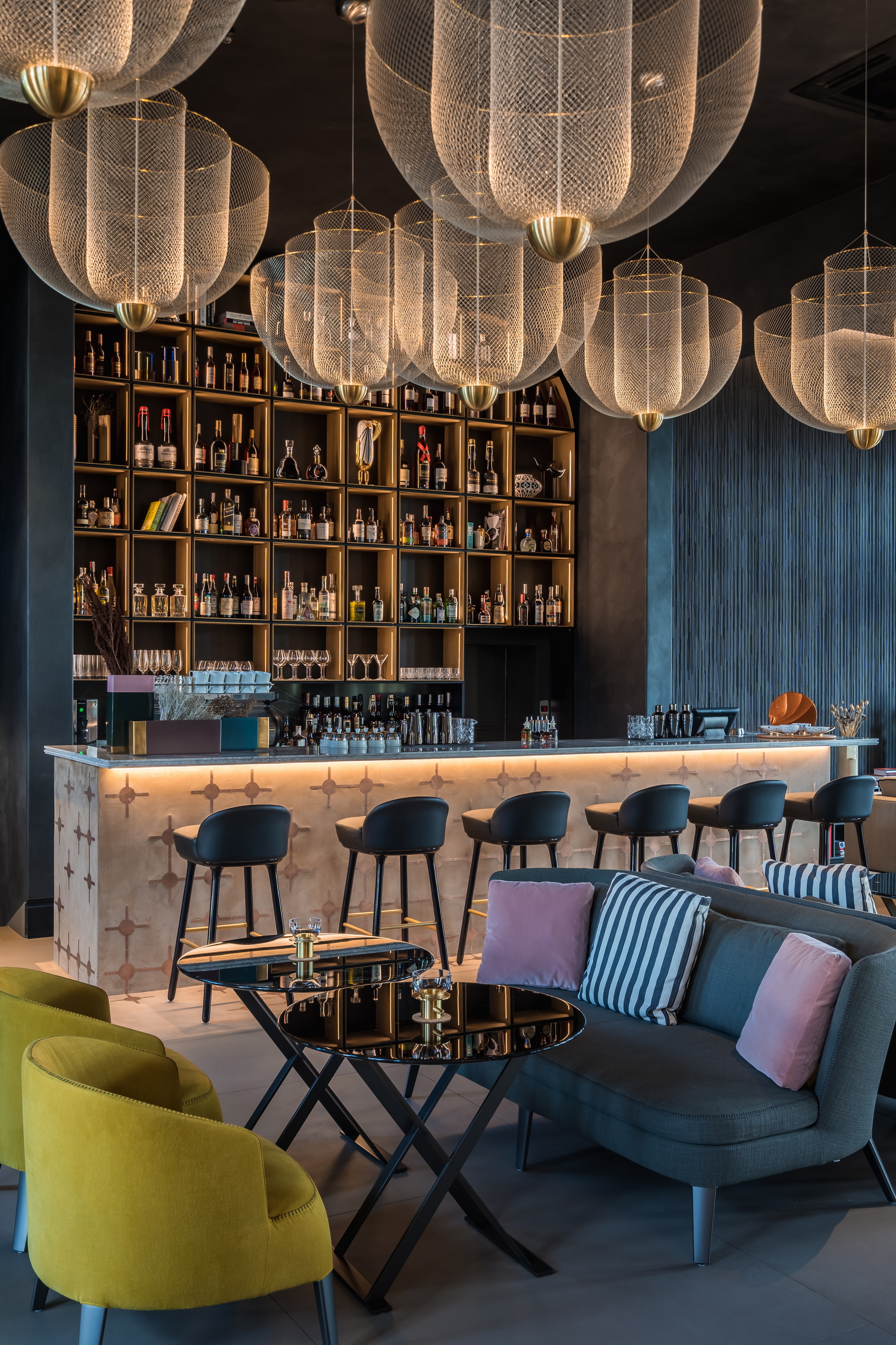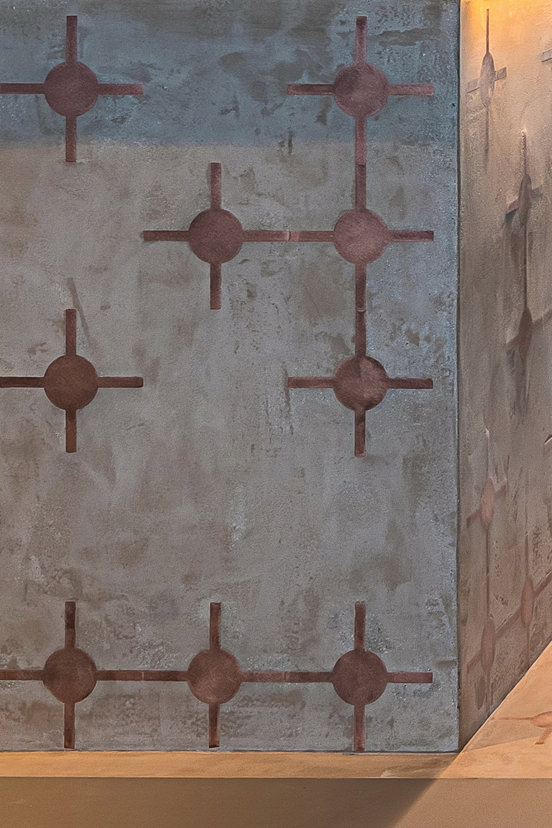 Lounge bar Monograph a Tbilisi su progetto di Motif Design Elements, Proact.e e Studio Irvine, realizzato con intonaco minerale di finitura TerraTon Plus Wall Liscio Polvere con inserti TerraFrame.