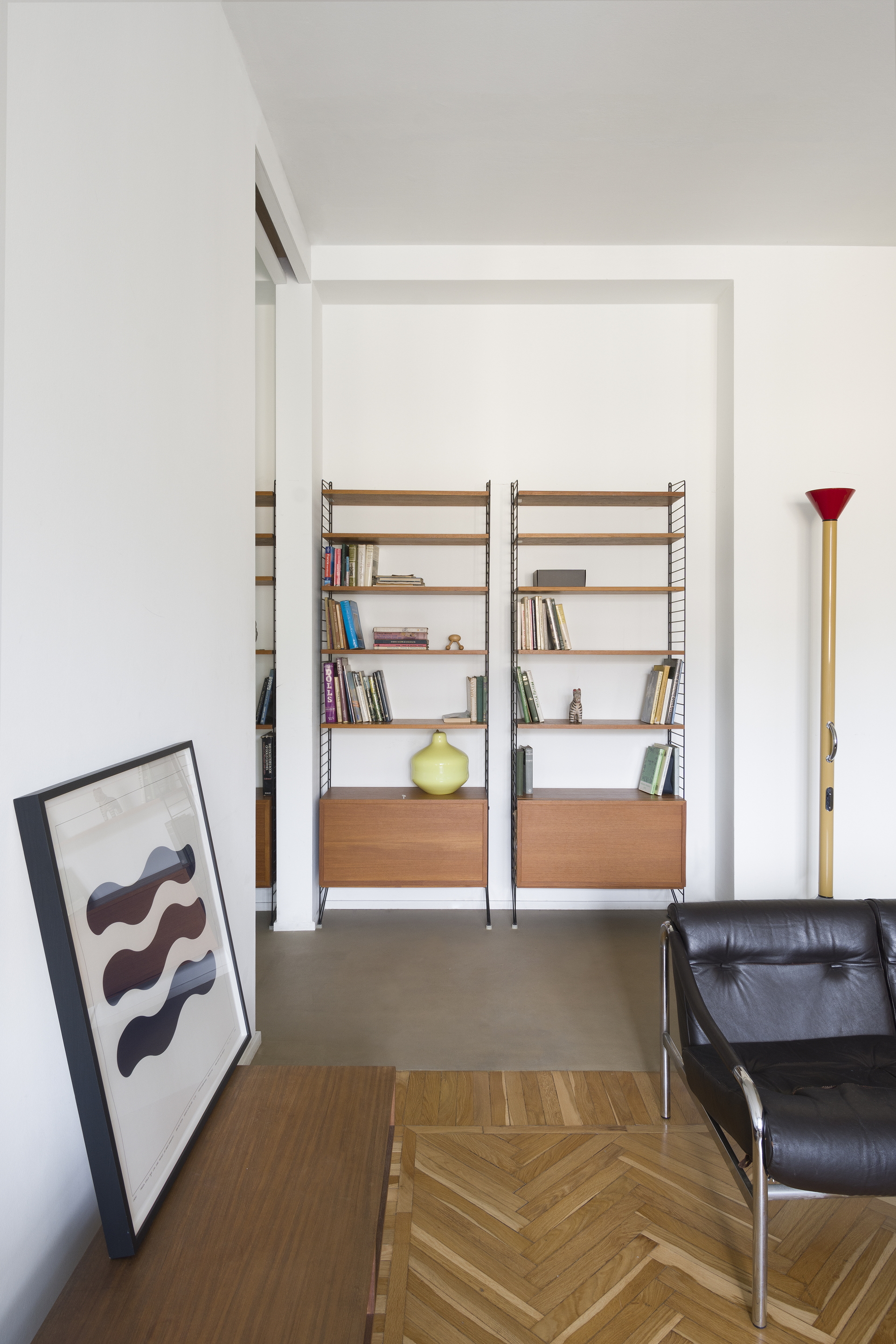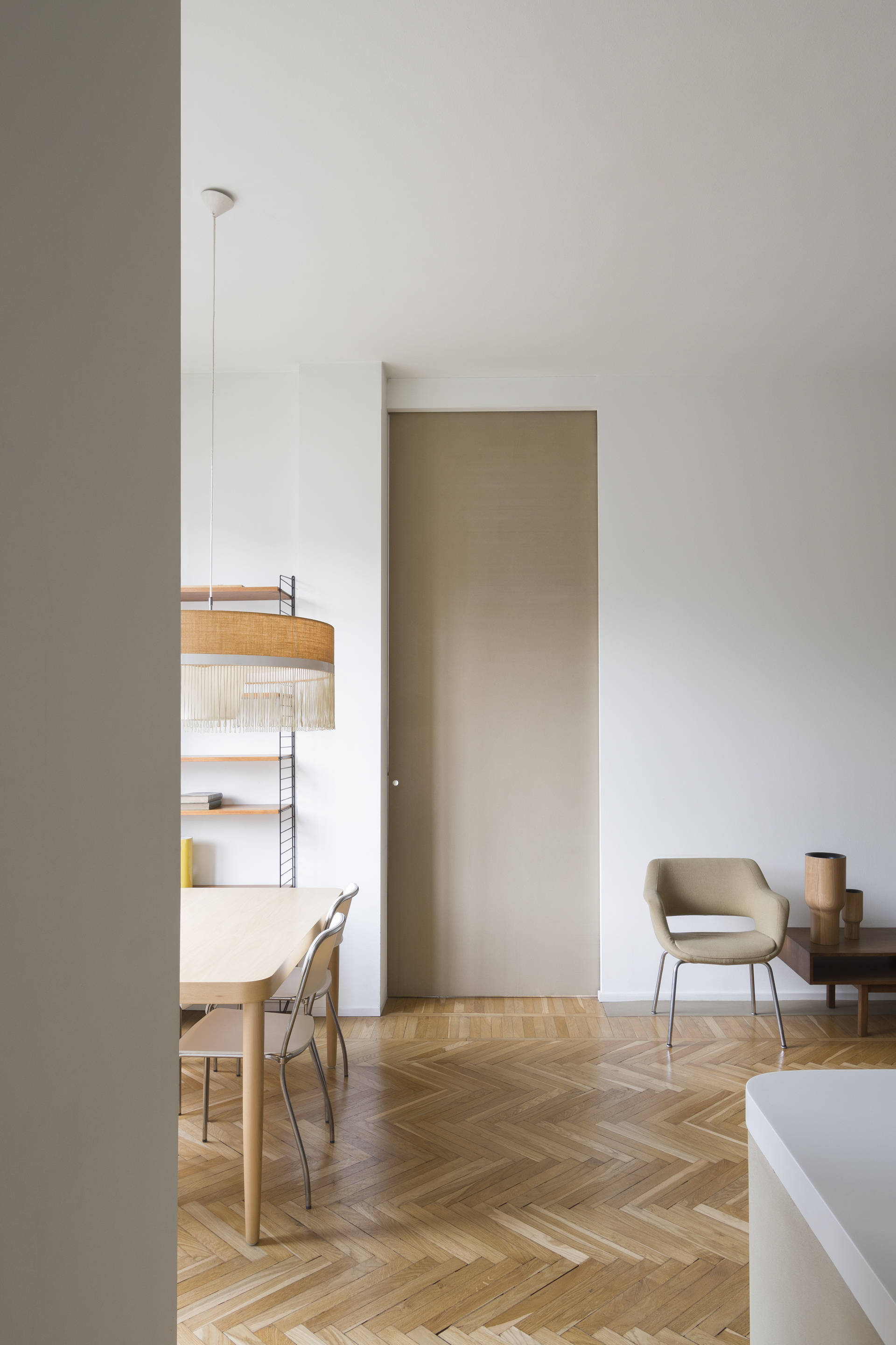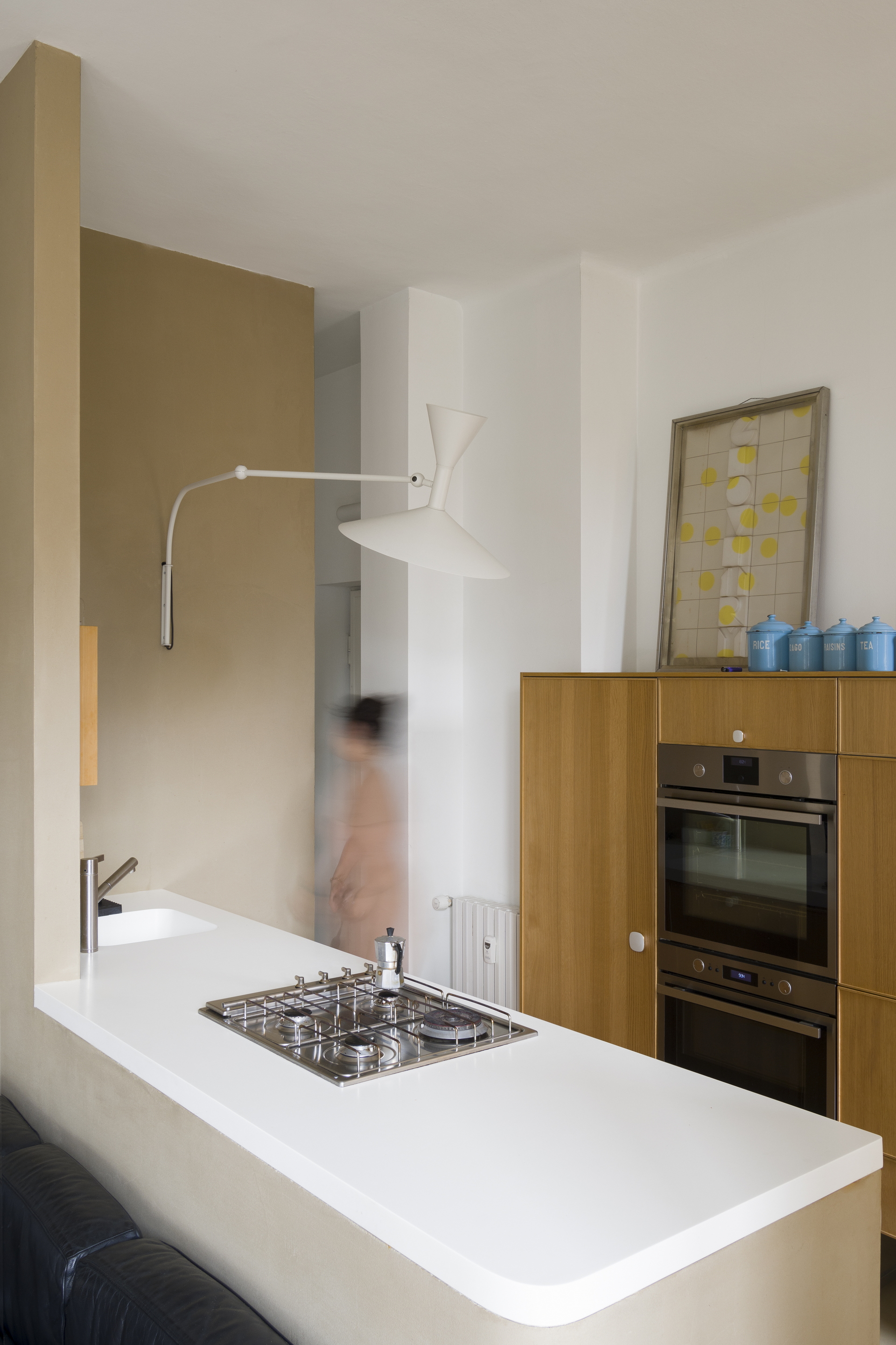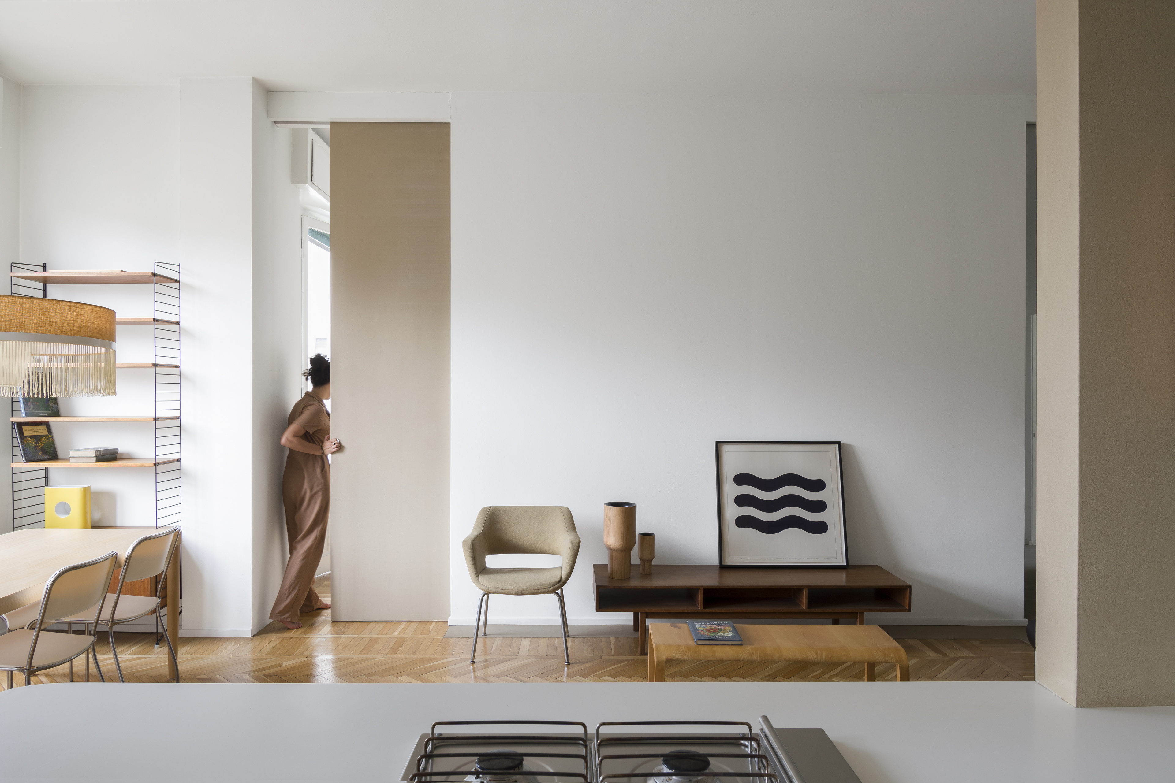 Intonaco di argilla a grana fine rinforzato con polimeri speciali TerraVista Plus Liscio Cannella di Matteo Brioni applicato su pareti e pannelli. Rivestimento a grana fine in argilla e resina epossidica TerraFloor Liscio Cannella applicato su pavimenti. Attico a Milano su progetto a cura di Marialaura Rossiello Studio Irvine, foto di Natalia Garcia