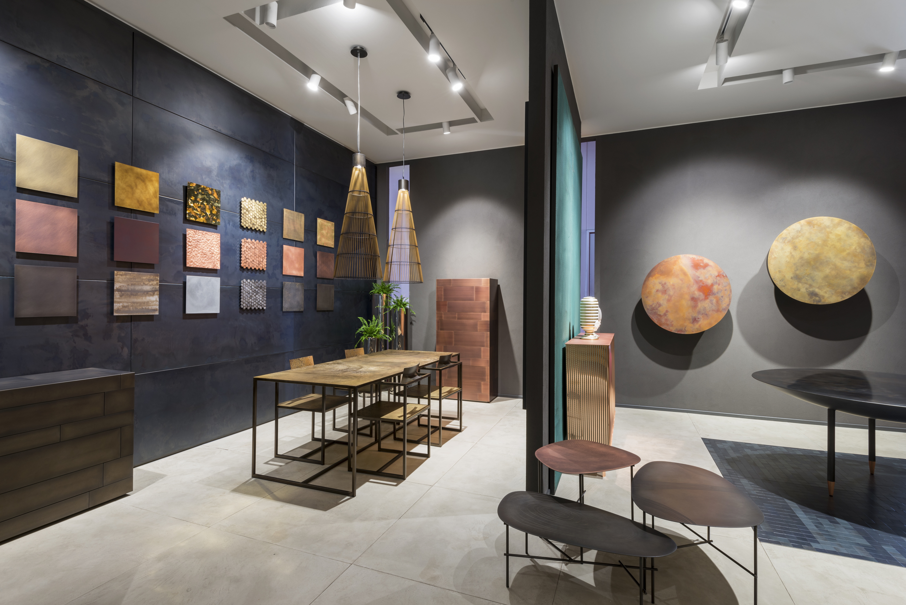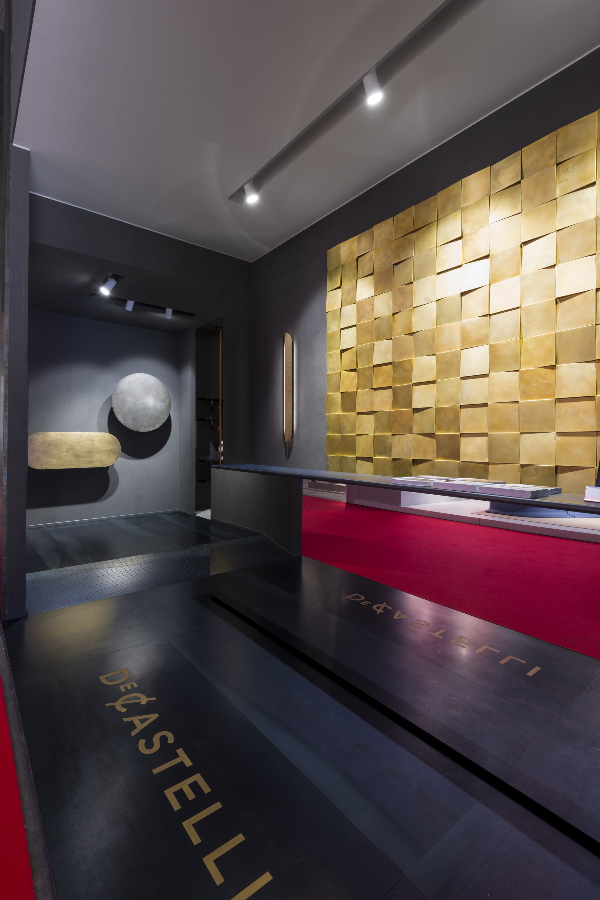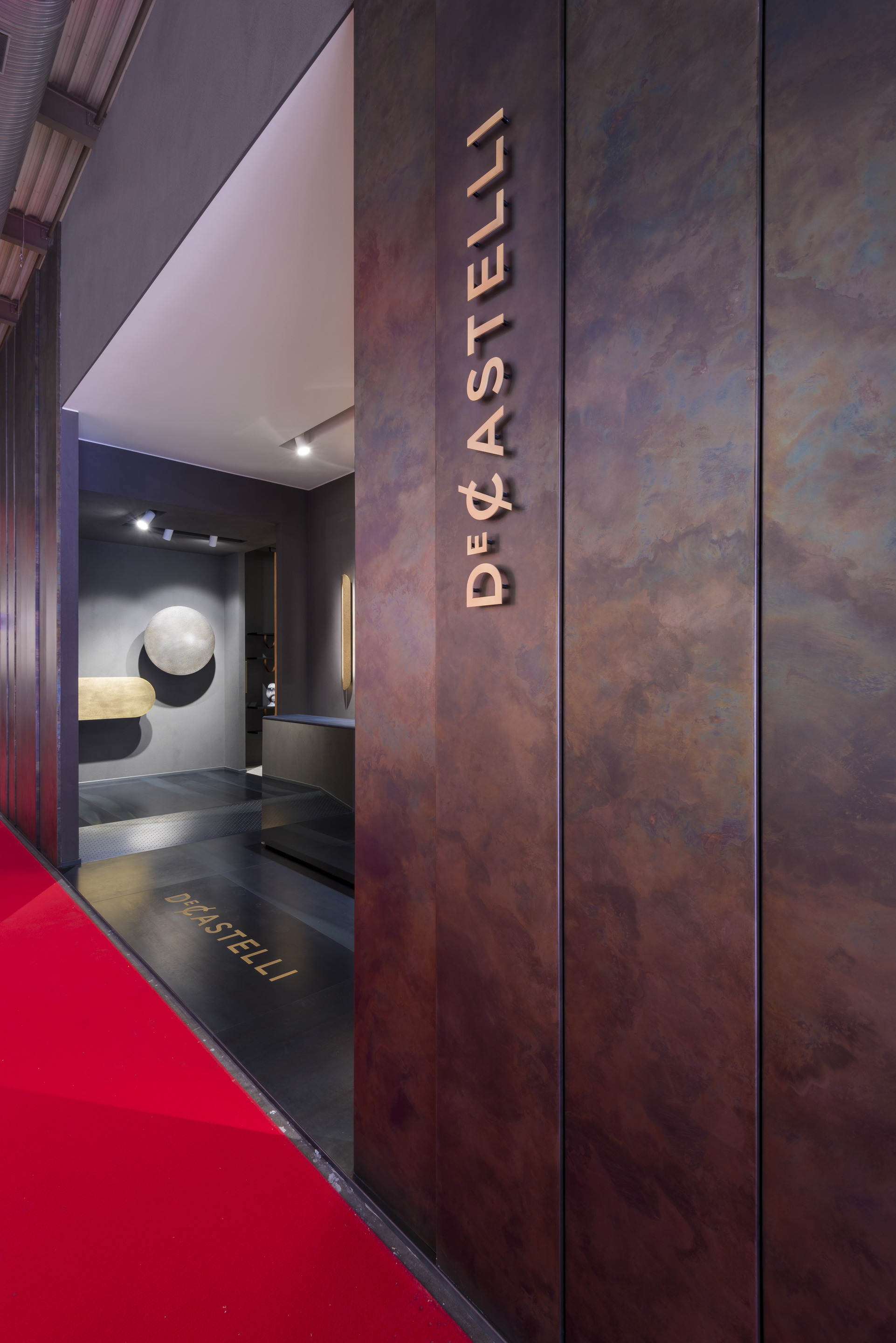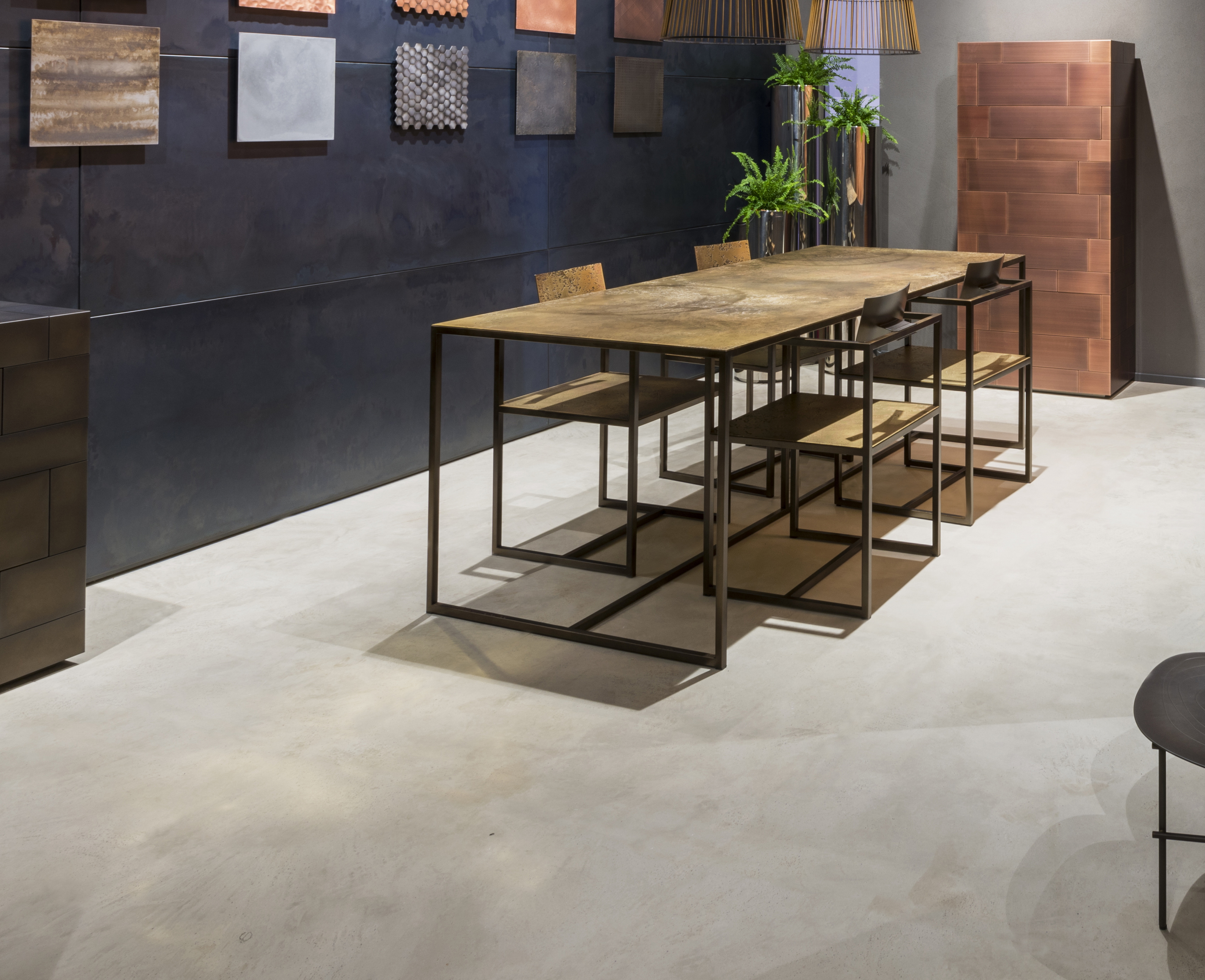 Stand De Castelli Salone del Mobile 2018 in Milan, made with mineral plaster TerraTon Floor Structured Polvere (dust) color, photos by Federico Sgarbossa